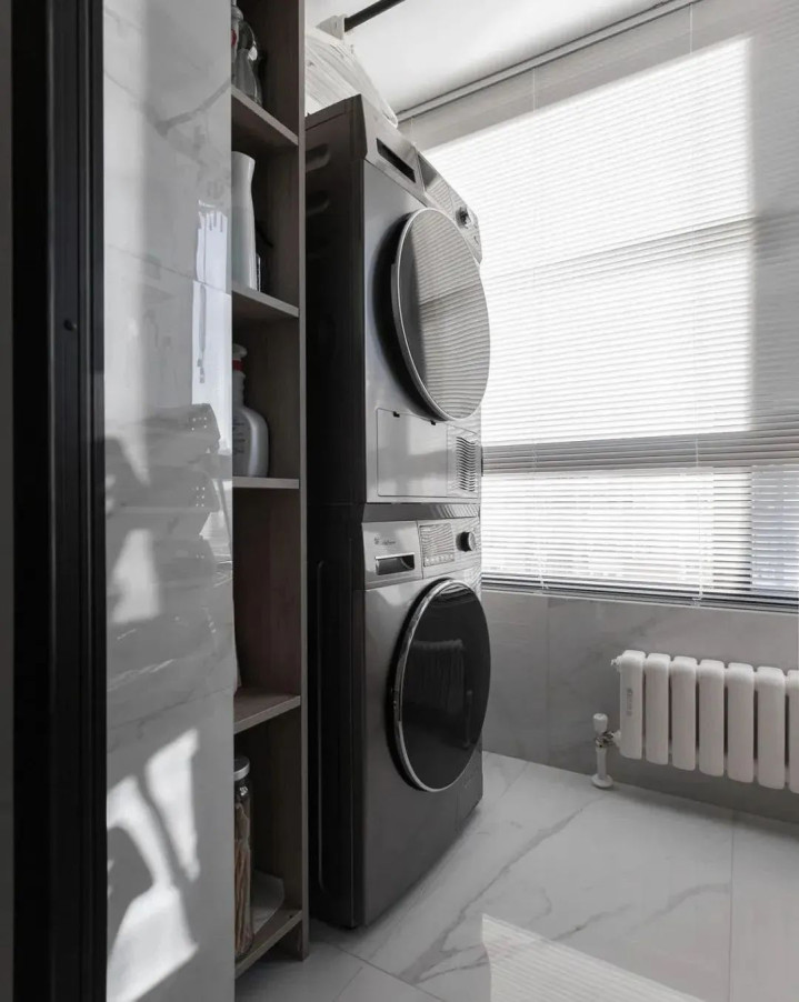 阳台把 “空间利用” 做到了极致 —— 墙面位置嵌入了洗衣机和烘干机,外面用储物柜包起来,既不占地方,又让阳台看着整整齐齐。