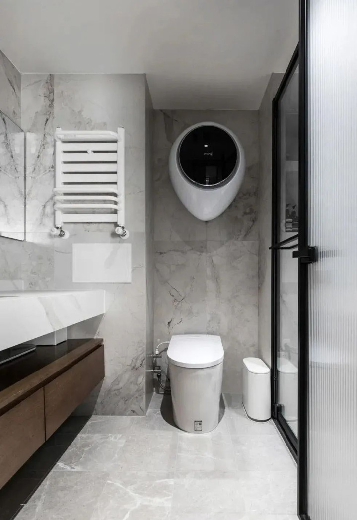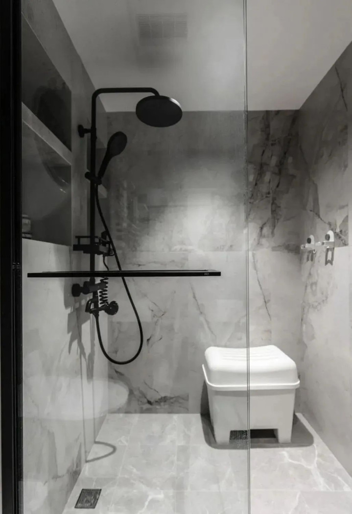 湿区利用墙面厚度做了壁龛,沐浴露、洗发水往里面一放,既方便拿取,又不用额外装置物架,整个卫生间看着整洁又清爽,满是质感。