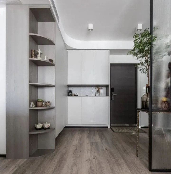 玄关:L 型柜体藏巧思,弧形过渡显温柔