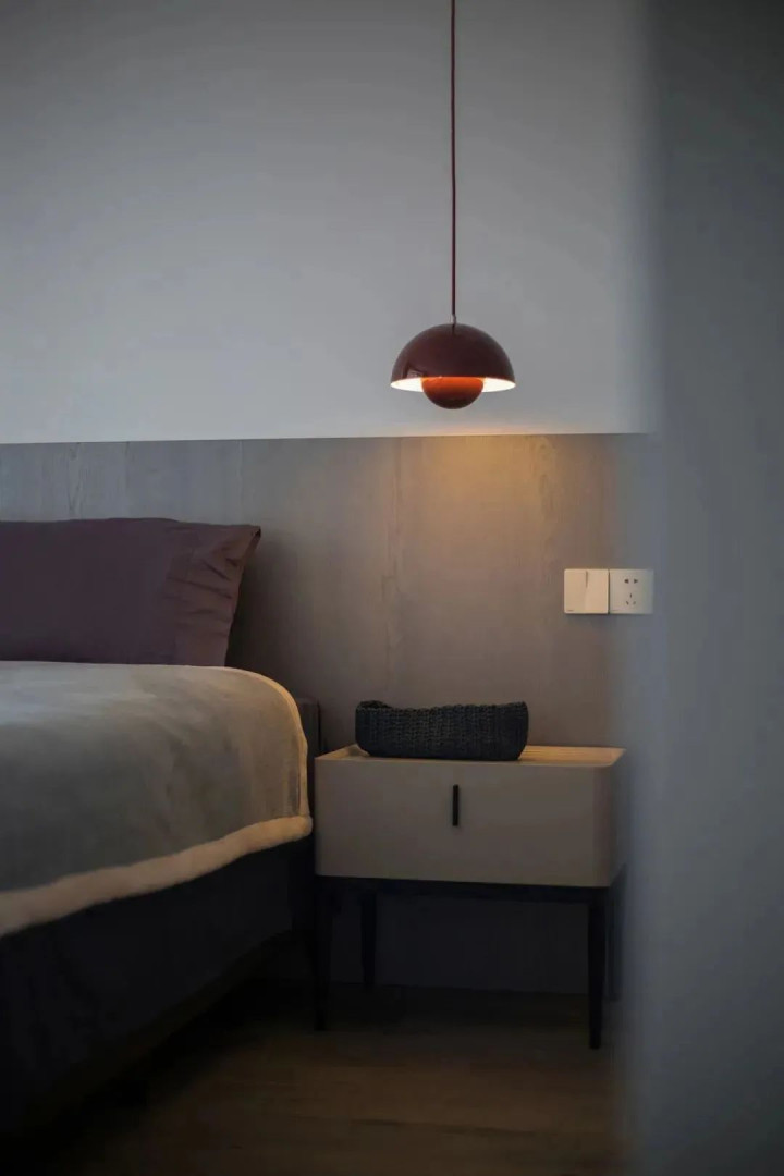 另一侧是简约款床头柜,搭配一盏酒红色吊灯,暖光晕开时,整个卧室都浸在静谧舒适的氛围里,让人更容易放松入睡。