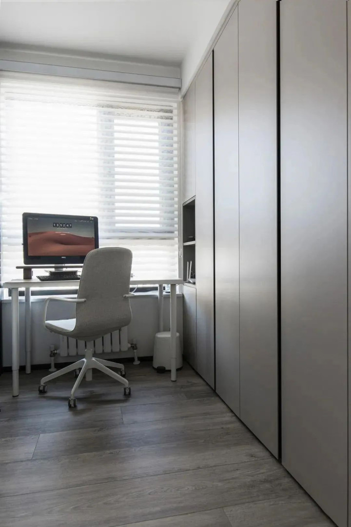 书房里做了整面嵌入式储物柜,储物空间管够;书桌靠窗摆放,白天写东西时,阳光透过窗户落在书桌上,明亮又舒服。