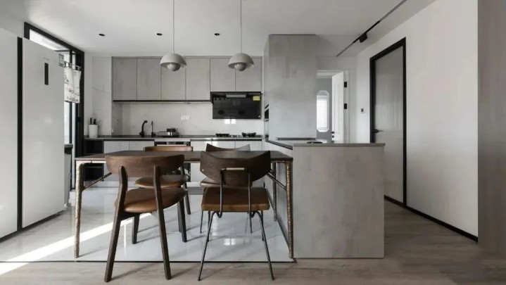 餐厨空间紧紧相连,延续了整体的简约素雅,却又藏着设计巧思。