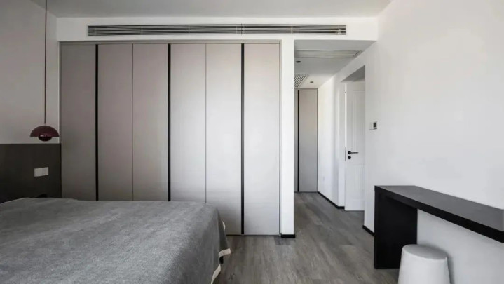 床尾放了一张线条简洁的长桌,旁边是顶天立地的大衣柜,衣柜局部用黑色线条勾勒,悄悄拉伸了层高的视觉感,换季的衣物、被褥都能往里放,收纳能力满满。