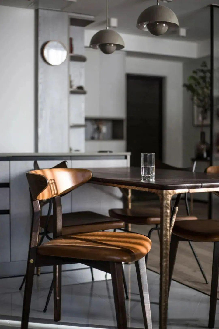 实木调的餐桌椅摆在餐厨区,浓郁的木色带着复古气息,餐桌背靠岛台,家人吃饭时能随时和在岛台备餐的人说上几句话,情感交流从未如此自然。